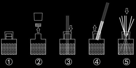 • 打开瓶塞,将藤条的一端浸入香熏液中, 待藤条湿润后取出,再将另一端放入瓶中即可